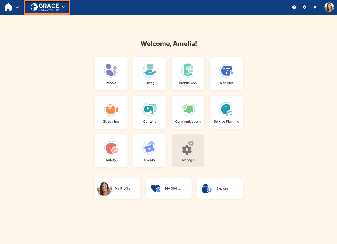 The Org Switcher is found in the upper left-hand corner of your Amplify page, next to the App Switcher. As with the App Switcher, simply click on your organization logo to open a menu, from which you can select or search for the child organization you wish to access.
